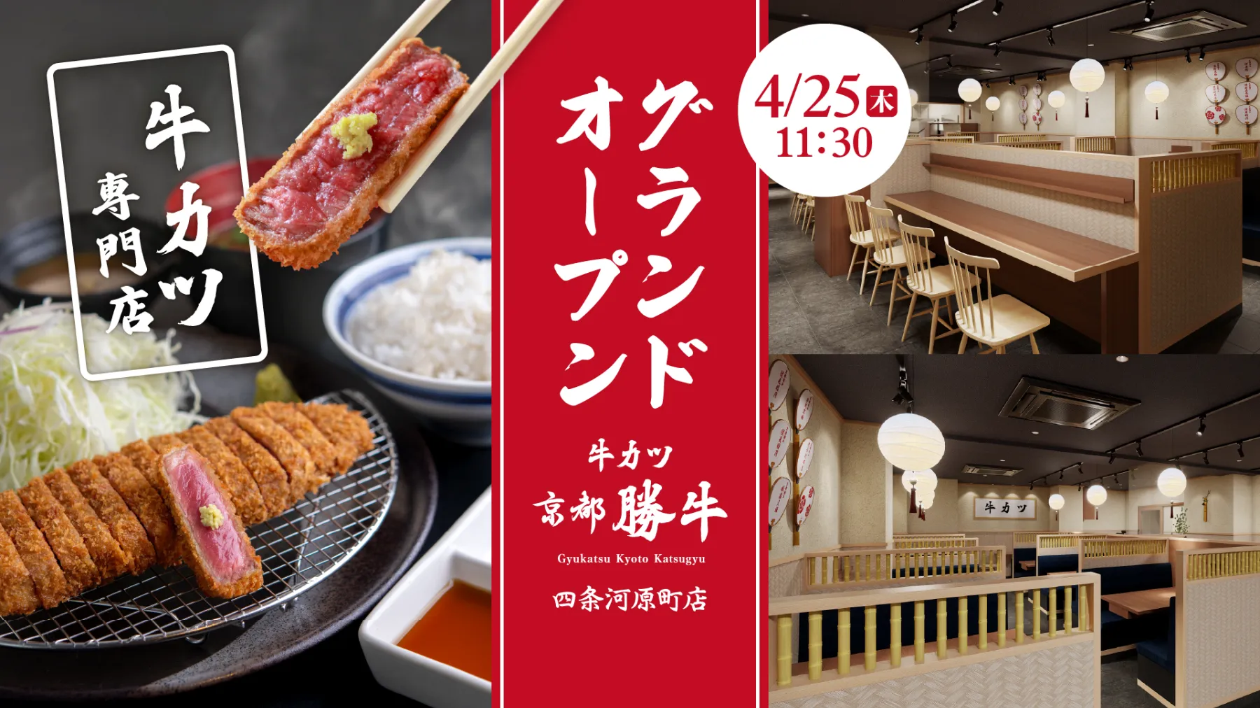 Business hours: 10:30-23:00 (LO 22:30) *Open from 11:30 on opening day only Store page:https://gyukatsu-kyotokatsugyu.com/store/shijo-kawaramachi
